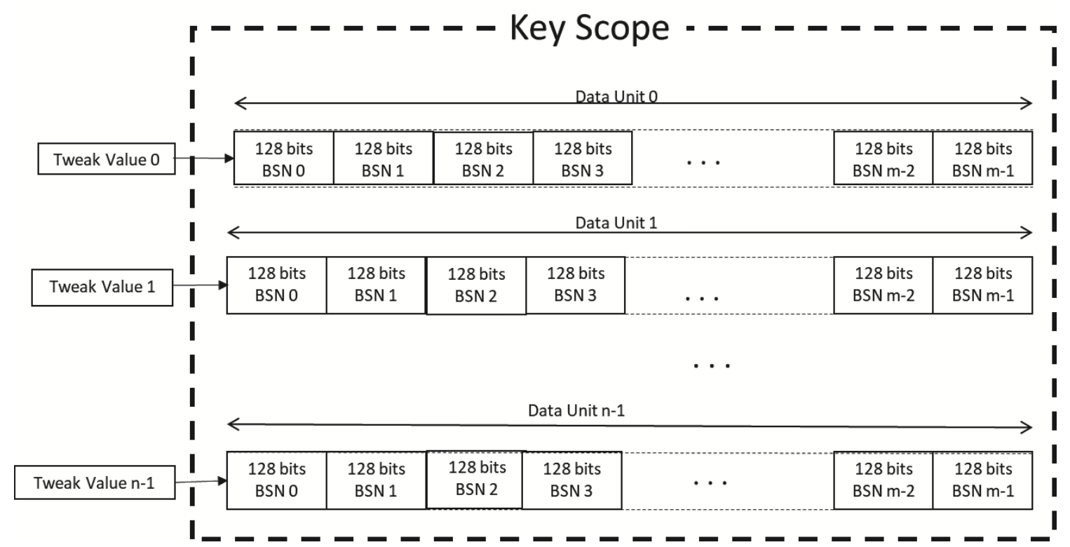 - A Data Unit can be many 128-bit blocks (the standard says up to \(2^{20}\) to be precise), but a single Data Unit has a single Tweak.